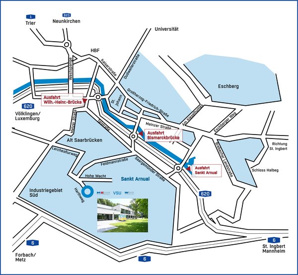 • Auf A 620 bis Ausfahrt Saarbrücken-Bismarckbrücke (Nr. 18)