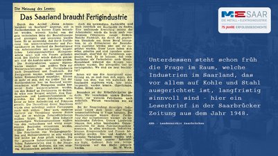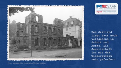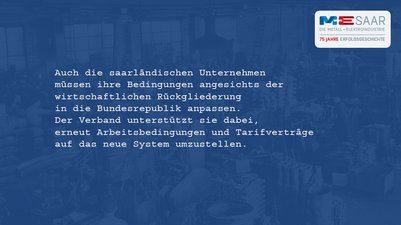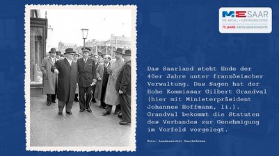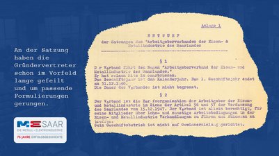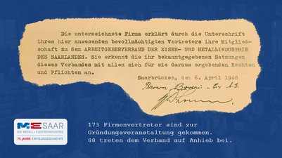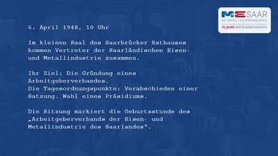 Es war kein großer Event, wie man es heute erwarten würde. Rund 170 Vertreter der saarländischen Industrie hatten sich am 6. April 1948 im Saarbrücker Rathaus zusammengefunden, um einen neuen Arbeitgeberverband zu gründen. Das Programm der Versammlung war kurz: Die Satzung musste verabschiedet und ein Präsidium gewählt werden. Damit war der "Arbeitgeberverband der Eisen- und Metallindustrie des Saarlandes" gegründet worden.