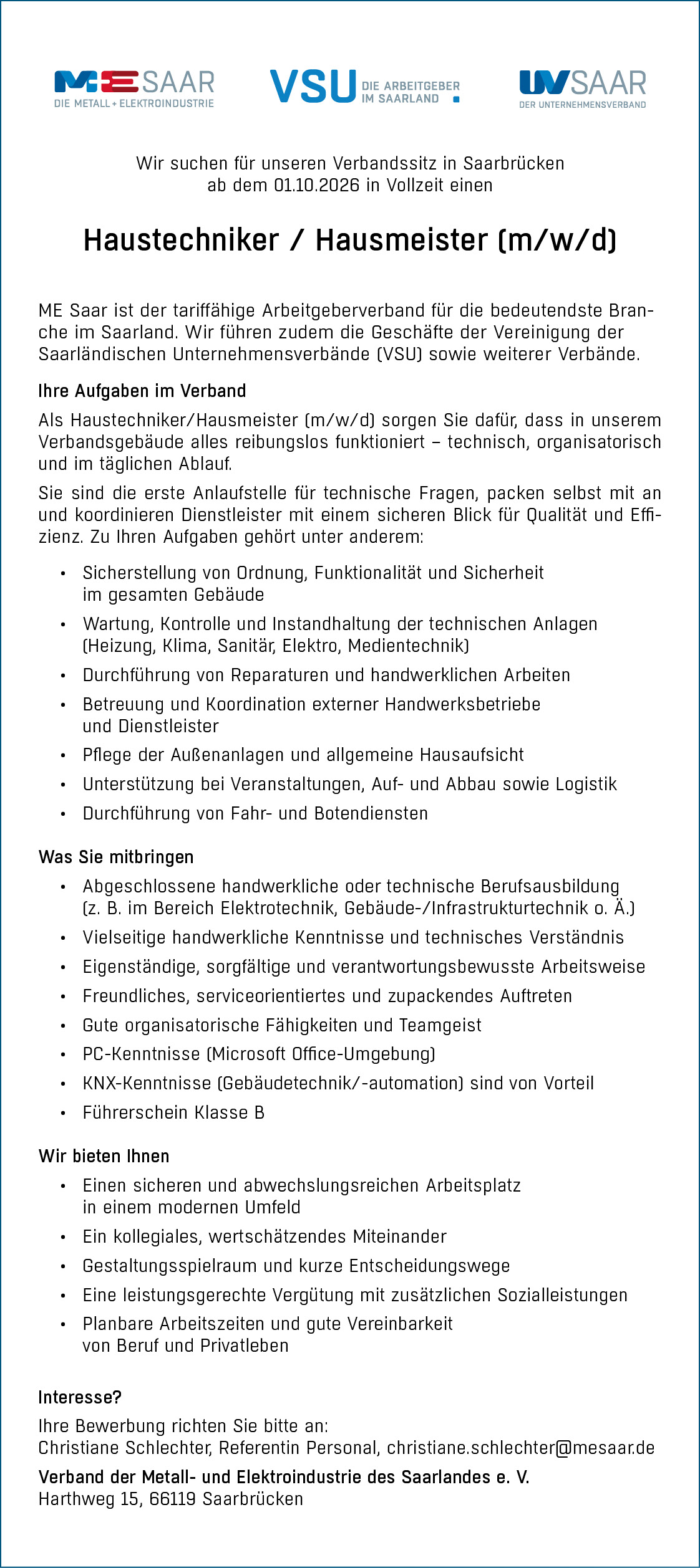 ME Saar sucht Haustechniker/Hausmeister (m/w/d)